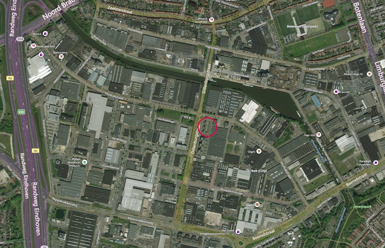 Deze kantoorruimte aan de Dillenburgstraat 7E op Bedrijventerrein De Hurk te Eindhoven is gunstig gelegen middels 3 op- en afritten aan de A2/N2, nabij de A67, A50 en de A58 en tevens aan de rondweg van Eindhoven. Middels diverse buslijnen en HOV-halte is het terrein tevens met openbaar vervoer goed te bereiken vanaf Centraal Station Eindhoven, Eindhoven Airport en Veldhoven.