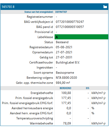 Het kantoorgebouw beschikt over het energielabel A welke geldig is tot 27-07 2031.
