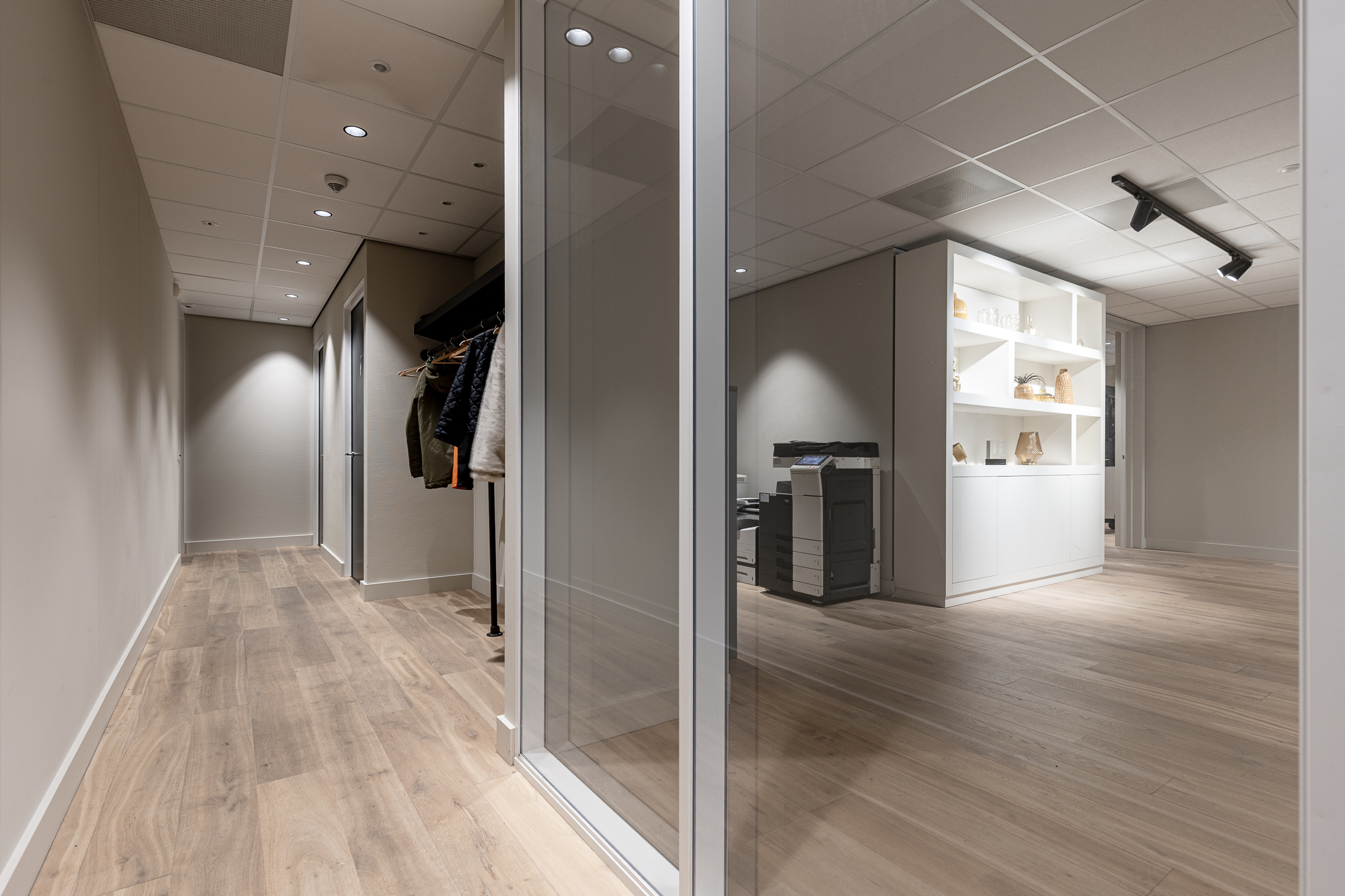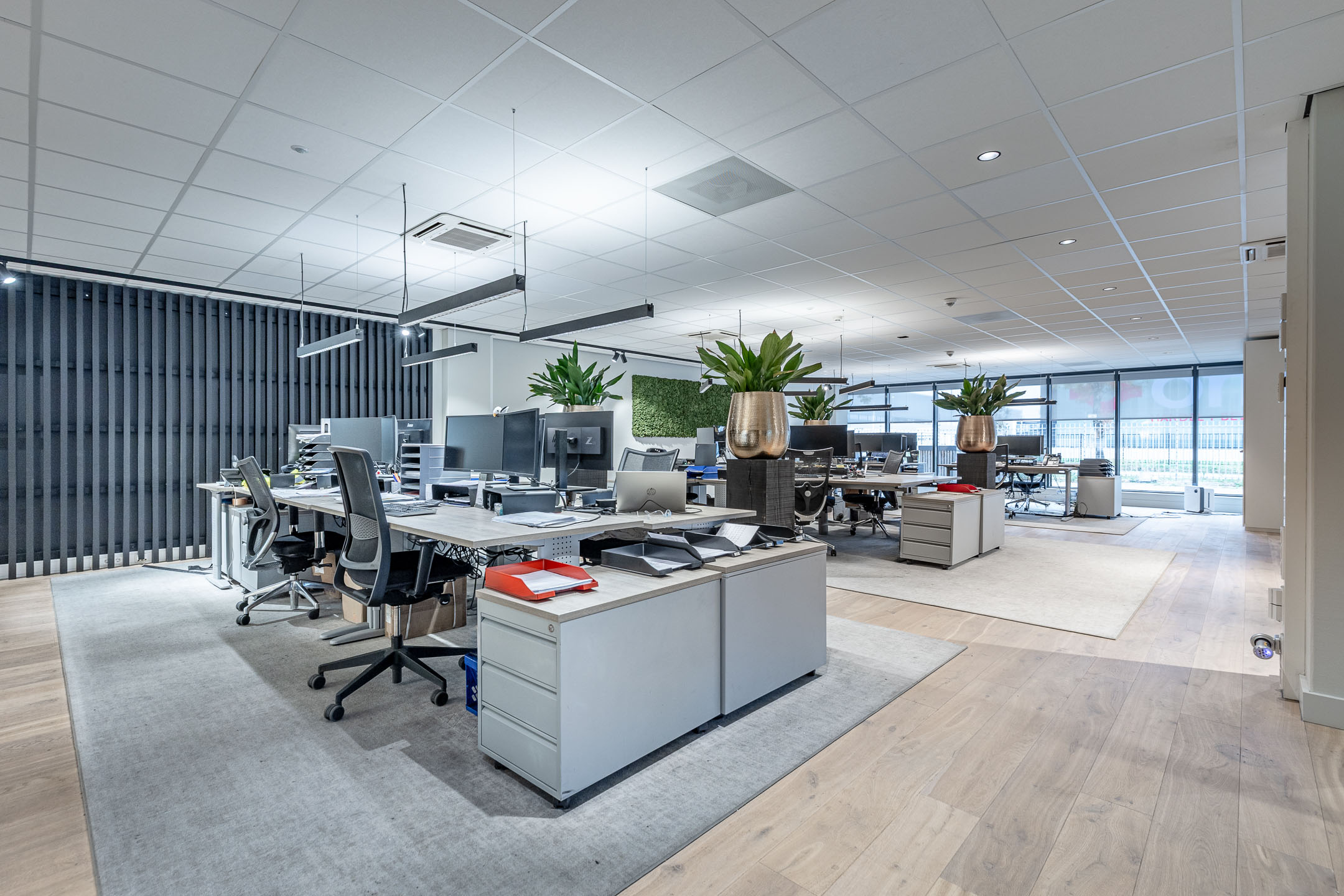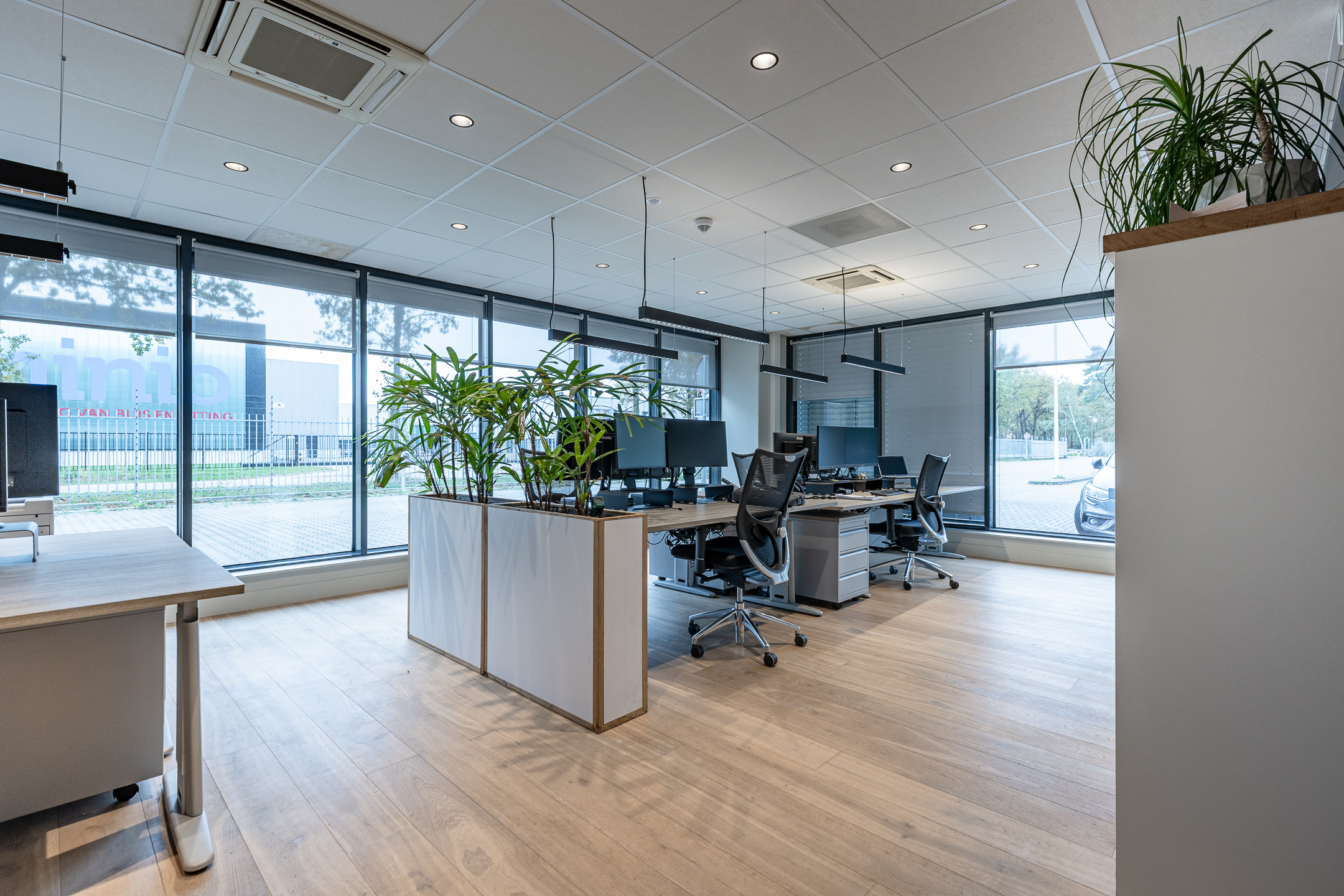 • huidige indeling door middels van glaspanelen en systeemwanden