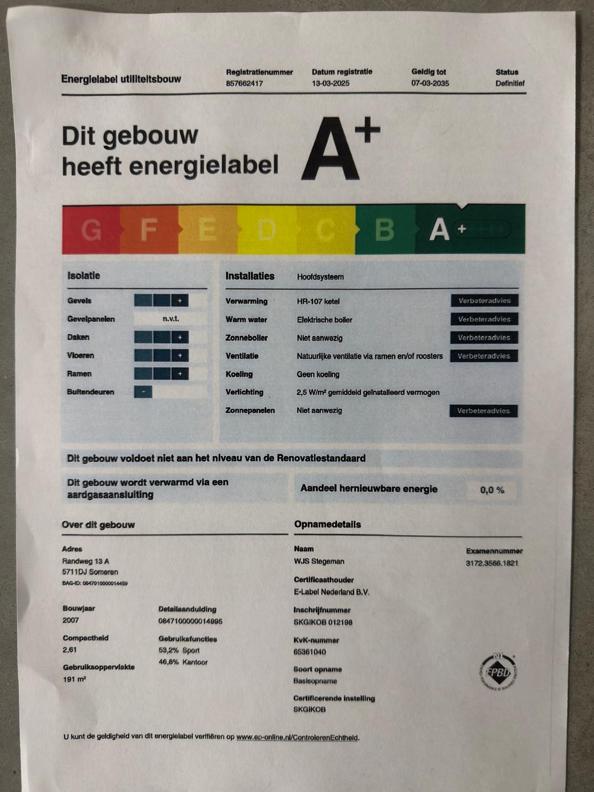 De showroom/praktijkruimte beschikt over het zeer gunstige energielabel A+ welke geldig is tot 07-03-2035.